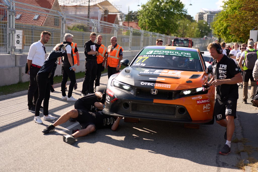 Marco Dahl ramte få centimeter forbi ideallinjen i ét af banens hurtige sving, og på en bybane bliver det hurtigt dyrt. Hyundai-køreren snittede først en blød del af banens barriere, og det var akkurat nok til, at bilen skiftede retning og ramte betonen med forreste højre hjørne. Dahl forsøgte at få bilen kørt i sikkerhed, men måtte uheldigvis stoppe midt i chikanen på langsiden, hvilket fremkaldte et rødt flag.