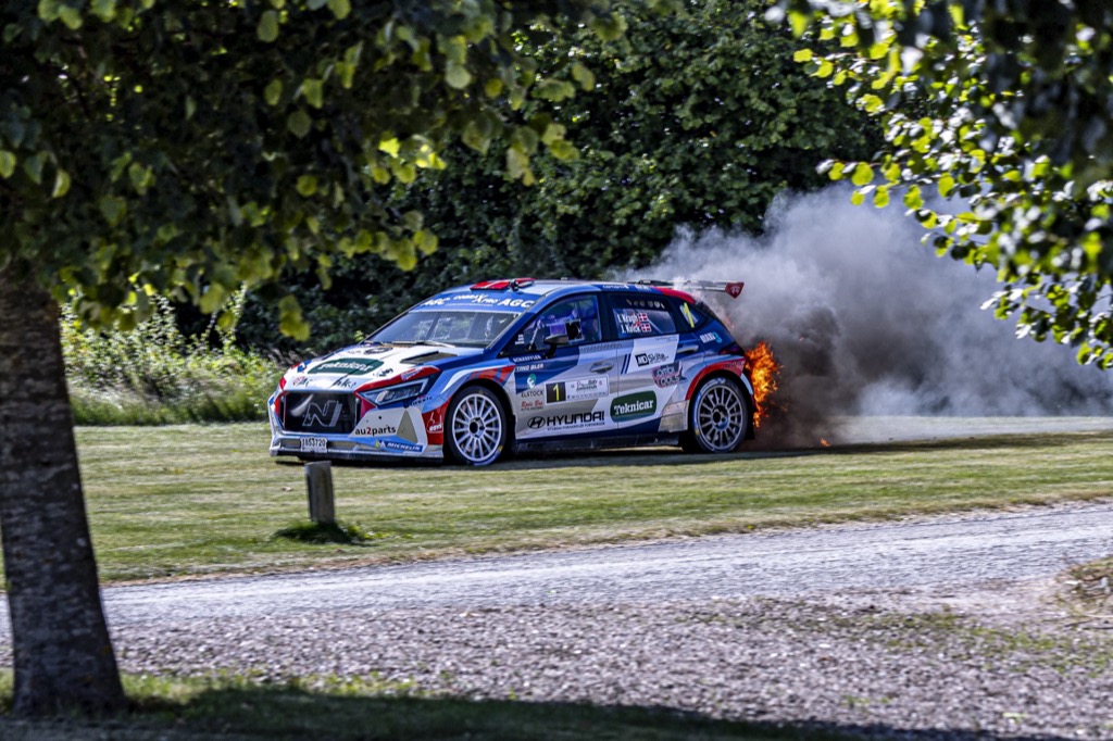Årets Rally Juelsminde blev på det personlige plan ikke det rally, som initiativtager og bagmand Ib Kragh havde håbet på. Sammen med sin co-driver Jeannette Kvick måtte han ved Klejs trille sin Hyundai i20N Rally2 ind til siden med store flammer fra rallybilens bagende.
