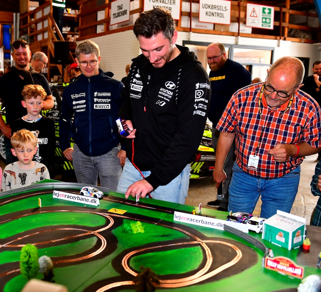 Mens rallybilerne gled gennem den tekniske kontrol fik mandskabet lejlighed til at prøve kræfter med en miniracerbane. Her er Simon Vallentin i aktion. Også på dét niveau var han hurtigere end rivalen Kenneth Madsen. (Foto: Morten Dam)