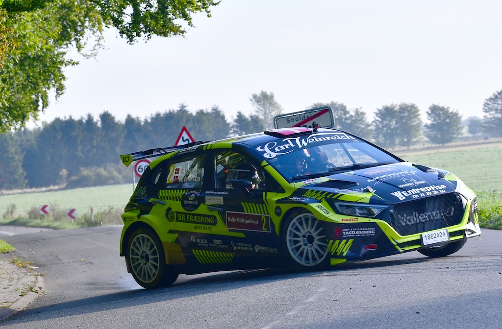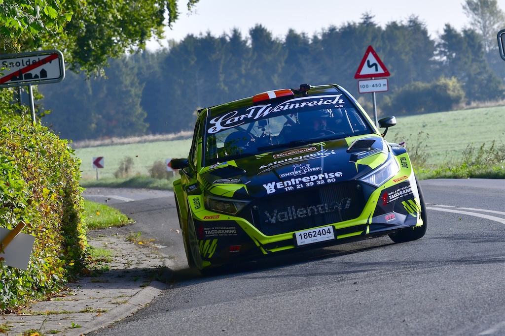 Vallentin og Isaksen på lørdagens første hastighedsprøve ved Snoldelev og på vej mod totalsejren i Rally Midtsjælland, fjerde runde af Dansk Super Rally 2025 med start og mål i Viby Sj. (Foto: Morten Dam)