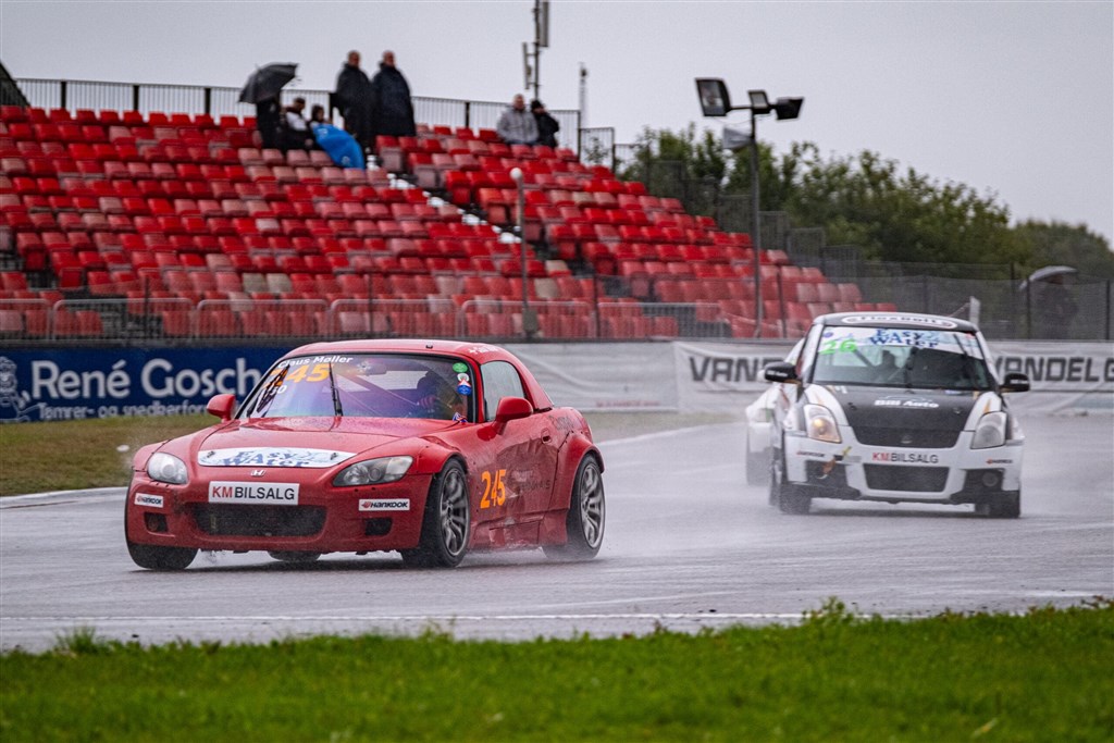 Så let var det næsten også for Claus Møller Jensen, der i sin lette Honda S2000 nærmest dansede rundt på Padborg Parks våde asfalt. Konkurrenterne i Light-klassen kunne ikke holde trit med nordjyden, der sikrede sig tre generelle andenpladser i weekendens løb. Gruppen af BMW’er kæmpede også mod det våde element, og det var tydeligt svært at få alle hestekræfterne fra hjulene og ned i asfalten.