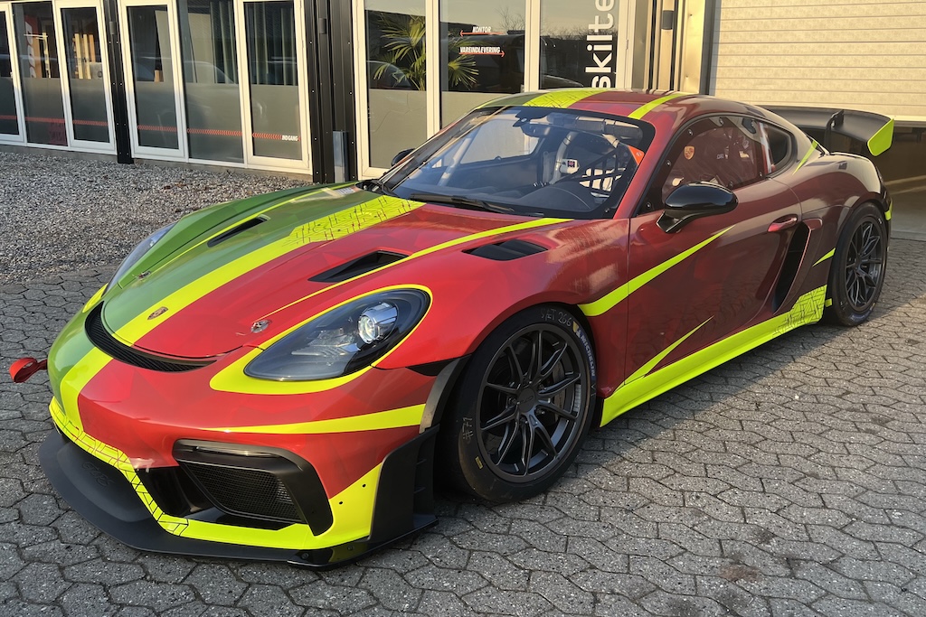 Dekorationen af FM Racings nye Porsche 718 GT4 er på plads. Den ene halvdel består af den grønne farve fra Frank Laursens Legend-racer, den anden halvdel fra den røde farve fra Mikkel Rybergs Legend-racer.